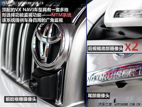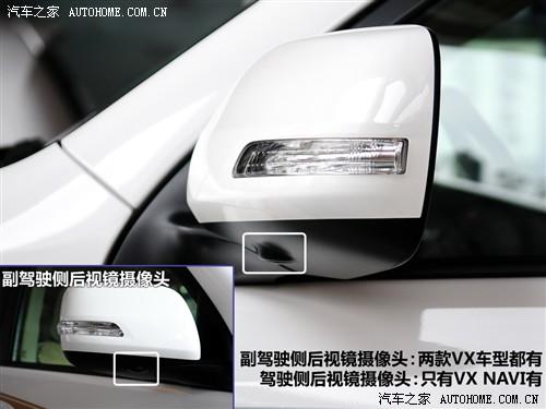 配置上的區別首先在前臉格柵就能發現,因為在車標下面隱藏了一個攝像頭,而這在低配車型上是沒有的,與之搭配的是正副駕駛后視鏡下面和車輛尾部也各有一個攝像頭,四個攝像頭組成了VX NAVI車型的“MTM多地形選擇功能監視系統”。VX車型則沒有正駕駛后視鏡上的攝像頭。