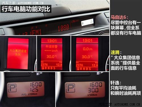 在這方面,馬自達6表現出了中型車的一些優勢,有軟性材質的中控臺、四門一鍵上下的車窗、鋁合金全尺寸備胎和四方向調節的多功能方向盤,只是因為設計年代較早而沒有行車電腦;速騰的表現也不錯,他有手感最好的中控面板和最強大的行車電腦,但備胎不能令人滿意,做工也出現一點瑕疵;軒逸在這方面并沒有表現出日系車型的優勢,這里體現出了一些他在成本上控制比較嚴格的不足。
