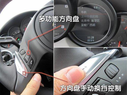 新卡宴的方向盤包含了很多功能,最為重要的是位于兩側拇指位置的換擋按鈕,向下推按鈕車輛會增加一個檔位向上抬起按鈕車輛會降低一個檔位,這對于喜歡體驗風馳電掣般駕駛感受的車主來說一定是他們最為喜愛的配置了。