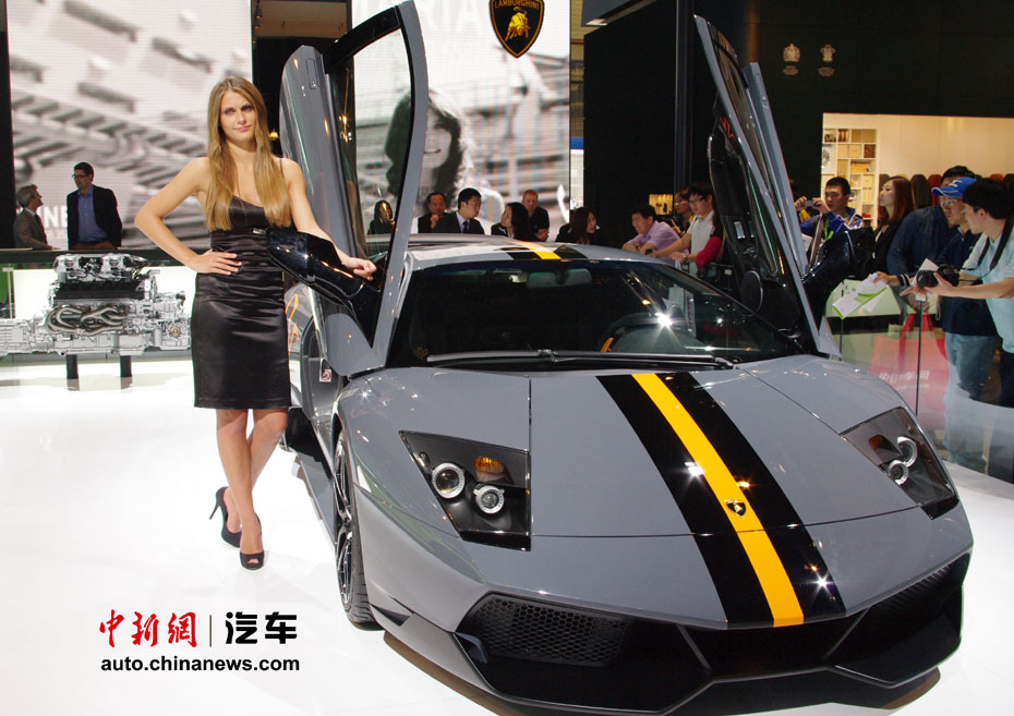 在人流如織的海外汽車巨頭的展館里,天價豪車成了當仁不讓的最搶眼明星,相形之下即使再靚麗的車模也黯然失色。圖為蘭博基尼Murciélago LP 670-4 SuperVeloce