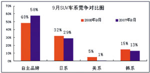 統計數據顯示,今年前9月,自主品牌SUV的市場占有率達到了58%,比起去年的48%增長了10%,其中長城和奇瑞瑞虎的銷量都在4萬輛左右,市場份額達到15%。
