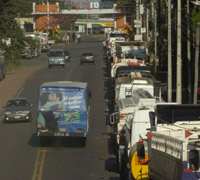 國際油價(jià)的大幅上漲使得石油嚴(yán)重依賴進(jìn)口的巴拉圭面臨嚴(yán)重的能源危機(jī),巴拉圭石油公司(Petropar)至今仍拖欠外國石油公司3.2億美元的費(fèi)用,國內(nèi)成品油供應(yīng)嚴(yán)重不足。近30%的公交車和出租車因?yàn)槿庇蜔o法工作,正在收割季節(jié)的農(nóng)業(yè)部門也因?yàn)槿加凸⿷?yīng)不足蒙受巨大損失。圖為7月15日,巴拉圭首都各加油站的運(yùn)油車在巴拉圭石油公司大門前排起長隊(duì),等待加油。