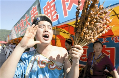 。牭轿魃桨舜筇幱瓮娴挠慰鸵馔獍l現,許多在城里才能吃到的老北京小吃在這里也能吃到了。爆肚、灌腸、炒肝……30余種風味小吃齊齊亮相,并一直持續到10月7日。