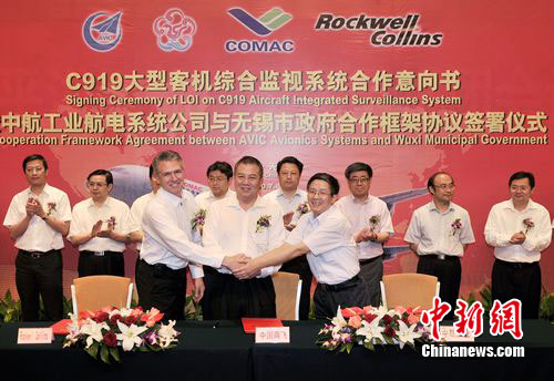 中新網(wǎng)無錫7月8日電(記者 孫權(quán))中國商用飛機有限責(zé)任公司、中航工業(yè)雷達與電子設(shè)備研究院和美國羅克韋爾柯林斯公司三方今日在無錫“握手”,確定國產(chǎn)C919大型客機綜合監(jiān)視系統(tǒng)的研制生產(chǎn)項目落戶無錫市濱湖區(qū)。幾年后,裝備“無錫造”綜合監(jiān)視系統(tǒng)的C919大型客機,將翱翔在中國的藍天,并飛行在世界各地。