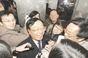 熱情的記者將電梯擠了個(gè)水泄不通,以致電梯門都無法合攏。最后,本報(bào)記者實(shí)在不忍范主席在狹小的電梯空間里無法“施展”,客串了一回“保鏢”,協(xié)助范主席成功“突出重圍”。