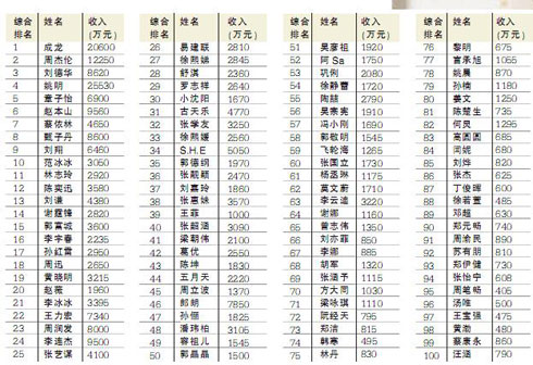 本次榜單前三名均來自港臺地區,56歲的功夫巨星成龍登上榜首,去年5月他成為在“鳥巢”舉辦個唱的第一人,150多名明星嘉賓輪番登臺,觀眾超過7.5萬人。周杰倫位居第二,沒有新唱片并不影響商家和粉絲的追捧,他努力嘗試新的影視作品,有得有失。排在第三位的劉德華出演了3部電影,由于婚事曝光備受關注。今年雖共有43位明星來自港臺,但其成就卻都仰仗于大陸市場。在他們眼中,兩岸三地之間的界限越來越模糊。小巨人姚明仍穩居大陸第一名。章子怡緊隨其后,雖然飽受爭議仍獲得25個封面報道。