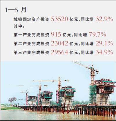 國家統計局今天發布的信息表明,今年前5月,城鎮固定資產投資53520億元,同比增長32.9%。其中,中央項目投資4734億元,同比增長28.0%;地方項目投資48786億元,增長33.4%。從產業看,第一、二、三產業分別完成投資915億元、23042億元和29564億元,同比分別增長79.7%、29.1%和34.9%。