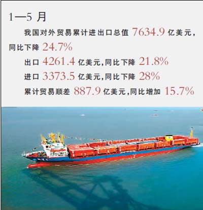 在內需呈現升溫態勢的同時,外需仍然持續萎縮。據海關統計,5月份當月,我國進出口總值1641.3億美元,同比下降25.9%,降幅比今年前4個月累計同比降幅加深1.5個百分點。其中出口887.6億美元,降幅加深5.9個百分點,進口753.7億美元,降幅收窄3.6個百分點。