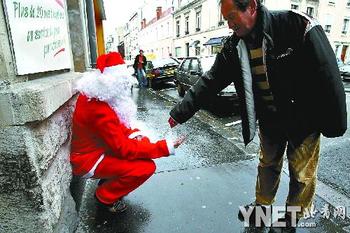 這不是某個電影的劇照,而是發生在法國雷恩的真實一幕。配圖的介紹說,趕上金融危機,“圣誕老人”也缺錢,為了籌錢分發禮物,開始在街上乞討。