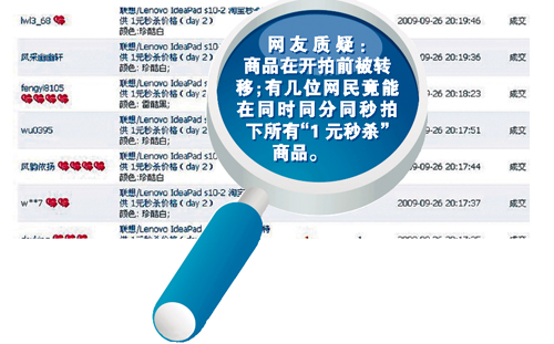 淘寶的安民公告,仍然為部分網友所不能接受。天涯網友“秋風月無痕”認為,淘寶沒出面解釋何以有三人能在同一分同一秒同時秒下三件商品。“內有種種怪異之事,不得不讓人想到這是一場欺騙廣大中國人民的炒作行為。如果淘寶不能給出合理的讓人信服的解釋,那么最終受害的不單單是廣大受騙的群眾,更是淘寶網。” “秋風月無痕”及幾名網友隨后在跟帖中貼出當晚截圖,聲稱既然當晚人太多,“不能正常瀏覽頁面”,而實際上商品已經在20時03分之前下架,但網友卻截圖發現有多條20時17分到20時19分的記錄,“淘寶怎么解釋這幾條記錄,03分到17分之間是空的,但是17分到19分之間突然冒出幾條記錄,這能讓人不懷疑是做了手腳嗎?”