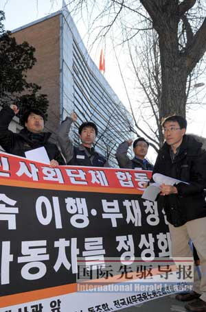 1月13日上午,中國駐韓大使館門前的寧靜被打破:30多名韓國雙龍汽車工會成員高舉橫幅標語,向早已等候在現場的媒體記者宣讀了一份聲明,要求中韓兩國政府采取救助措施,查處所謂的上汽“技術轉移”問題。抗議活動進行了一個多小時。