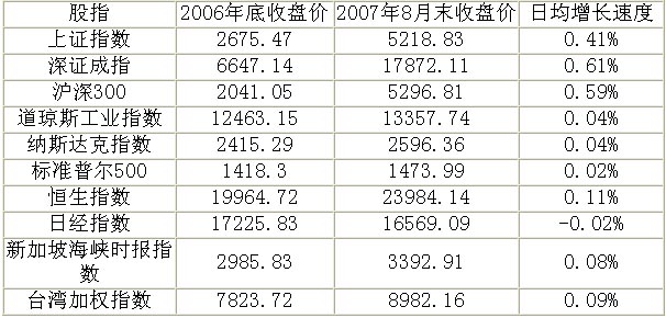 由表2可見,在2006年12月31日至2007年8月31日這段期間,我國(guó)股指的日均增速遠(yuǎn)遠(yuǎn)高于境外各主要股指,確實(shí)可以說是處于暴漲期。