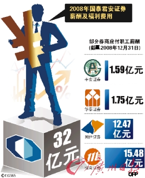 近日記者獲得了一份《2009年國泰君安證券總裁陳耿工作報告》,細讀中記者發現,國泰君安證券2008年的薪酬及福利費用高達32億元,遠遠超出公司年初預算數的20.41億元。即使面對大熊市,國泰君安在滬深兩市的交易量也排在全國所有券商的前三甲。目前國泰君安員工數大約在3200人左右,按報告中32億元的總薪酬及福利費用計算,平均每個員工去年獲得的總收入就接近100萬元。