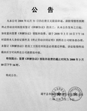 此后,遂平華強門口又張貼出公告,特別提示簽署《和解協議》領取補助費的截止時間為2008年3月10日。