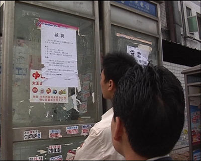 這就是他們倆頭一天交錢的地方,如今已是人去樓空,李美銳和肖方云白白損失了20塊錢,不過最終在記者的建議下,兩人還是在幾經(jīng)打聽后,來到了附近的一個勞動力市場,這是個很正規(guī)的中介機構,但在市場轉了一會后,兩人又碰到了一個難題。