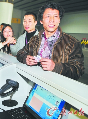 來自湖南邵陽、在中山橫欖鎮某建筑工地做泥水工的唐結元成了今年春運廣州實名制火車票查驗進站的第一人。昨天下午2時不到,他扛著行李來到琶洲展館候乘點驗證臺前。工作人員先將機票二維碼放在掃描器處掃了一下,電腦屏幕顯出L7688次車票的信息,還有唐結元的姓名和身份證號碼。接著她又將唐結元的身份證放在閱讀器上,電腦屏幕又顯示出唐結元的個人信息。接著,屏幕顯示“通過”字樣。工作人員隨即在車票上蓋上“廣鐵集團廣州火車站實名驗訖”的章。整個過程不超過20秒。據悉,對于一代證和其他十幾種的購票證件都需要人工驗票。