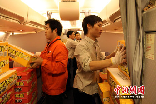 此次運輸貨物的飛機是沒有旅客的客機,因為西寧無法降落大型貨機,南航只能以 客機載貨。該批物資是廣東省府捐贈給玉樹地震災區的餅干、快食面等食品,共90357箱,總重量為38噸。因為飛機容量有限,該批物資分兩批承運,當晚首批裝載20.81噸。