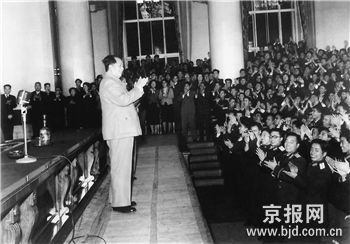 接著,毛主席給大家談了當時的國際形勢,他首先指出,十月社會主義革命是人類歷史上一個轉折點,國際共產(chǎn)主義運動的團結和蘇聯(lián)兩顆人造地球衛(wèi)星上了天,這兩件事標志了兩大陣營力量對比的新的轉折點……十月革命產(chǎn)生了新世界,經(jīng)過40年,新世界的力量已經(jīng)超過了舊世界……現(xiàn)在不是西風壓倒東風,而是東風壓倒西風。毛主席說到這里,大廳里又響起了熱烈的掌聲。