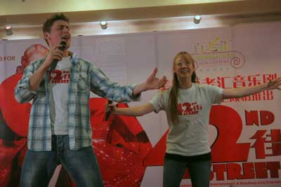 昨天下午,《42街》的幾位主演來到深圳大廈舉行了媒體見面會。為了增加現(xiàn)場氣氛,兩位中國年輕的踢踏舞演員被請上臺,一段熟練的舞蹈動作顯示了不俗的實力。盡管跟現(xiàn)場這些來自百老匯的專業(yè)舞者無法相提并論,但是他們的表演還是贏得了一片掌聲,而百老匯的演員們更是起身鼓掌叫好。而《42街》的演員們也現(xiàn)場露了一手,從小就學(xué)習(xí)跳舞、唱歌的男主角查爾斯和畢業(yè)于音樂劇學(xué)校的女主角克利斯汀用聲情并茂的表演充分顯現(xiàn)出了他們的演唱功底。