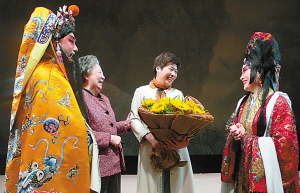 曲終,于丹雀躍著見到飾演唐明皇的蔡正仁和飾演楊貴妃的張靜嫻,捧上鮮花,還有敬意。