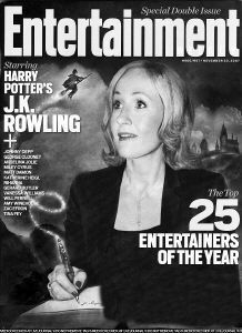 《娛樂周刊》按照一個班級里可能會出現(xiàn)的5種人來為娛樂界的名人定位,他們分別是天賦異稟、班中小丑、風(fēng)云達(dá)人、八卦之星和致詞代表。今年推出《哈利.波特》完結(jié)篇的羅琳沒被歸于其中任何一類,被選為“年度娛樂人物”。雜志認(rèn)為,羅琳完成了不可能完成的任務(wù),在電玩和在線游戲充斥、一切講究短小輕薄的年代,她施展魔法,讓數(shù)億大小孩抱著厚厚的印刷書籍愛不釋手,雜志如此評價說:“《哈利.波特》已賣出了4億冊,并且拍成了有史以來最賺錢的電影系列片,羅琳讓人們圍著她老式的印刷大書團(tuán)團(tuán)轉(zhuǎn),好像這就是地球上最火熱的新娛樂手段似的。”
