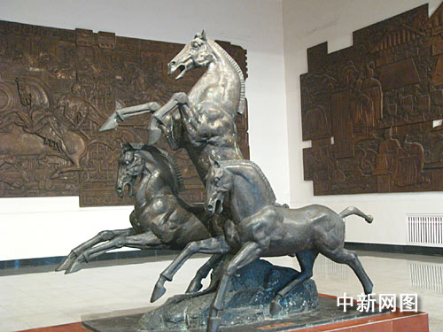 邯鄲博物館中央大廳的青銅馬雕塑和煅銅壁畫