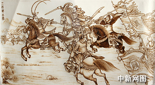 為避免干擾,王國棟把工作室設在女兒家樓房的地下室里。一塊案板,一盞臺燈,一把電烙鐵,一副老花鏡,幾本參考書,就是他創作的全部家當。每天早5點起床,晚11點休息,他把全部心思都花在了烙畫上。熟讀原著,找懂三國的朋友切磋,確定故事題目,反復修改,定稿,烙繪,又是一年輪回,老王的100米長卷81個故事圖譜也出來了。為了使畫面線條更加流暢,他苦心鉆研,改革了烙鐵的銅筆頭。為了增強表現力,他嘗試著在烙畫中添加輔料來增強表現力。這些,都使《三國演義》的繪制技巧和藝術創作又達到了一個嶄新的高度。