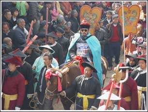 活動開始前,村民抬著社火而來,上面均立著裝扮成各種戲曲人物的孩童。各社裝扮好后,便陸續前來跪拜在“侯官府”大堂內正襟危坐的“牛老爺”,請他察看。“牛老爺”看社火前,會先派個衙役騎馬巡回視察分社,通報各社情況,督促整體進度。等第三道令一發出,牛老爺就啟程巡視。