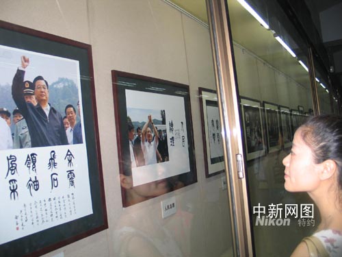 記者今天在開幕式現(xiàn)場(chǎng)看到,作品主要為篆書,每幅配以背景圖片,災(zāi)區(qū)人民的苦難、人民總理奔走廢墟之中的身影、殘?jiān)珨啾陂g不懈抗?fàn)幍纳⒕仍俦粧仐壊环艞壍呐Α粋(gè)個(gè)場(chǎng)景、一個(gè)個(gè)片段、一個(gè)個(gè)故事,充滿了震撼人心的力量。