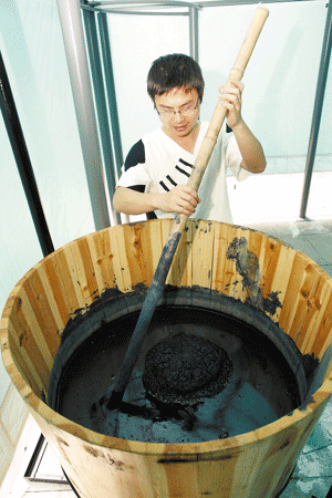 工作人員正在攪拌靛青。本報記者 李震宇 攝