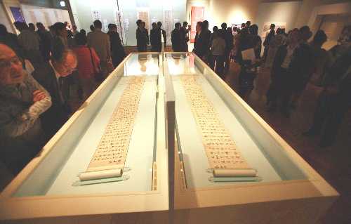 7月14日,在日本東京,人們在江戶東京博物館舉行的預覽會上觀賞故宮所藏的書法作品。為紀念中日和平友好條約締結30周年,7月15日起,以王羲之《蘭亭序》為代表的65件北京故宮館藏歷代書法名品將在東京進行為期2個月的展出 。其中,《蘭亭序》是首次在日本亮相。