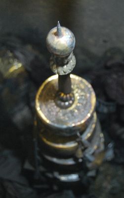 塔剎露出來后,曾主持過雷峰塔地宮考古的專家黎毓馨說,這是一個銀鎏金的七寶阿育王塔。但南京的工藝美術大師王殿祥提出了質疑,他認為這尊鎏金塔王是銅鎏金,而不是銀鎏金。奚三彩說,這尊塔表面鎏了金是肯定沒問題的,但里面是銅的還是銀的,目前還不能肯定,要等它完全被取出來以后,拿到科學儀器上檢驗一下才知道。
