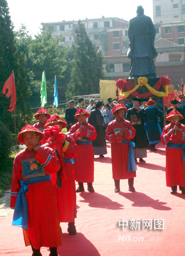 中新網吉林9月28日電(蒼雁) 9月28日上午9時,吉林市與美國洛杉磯孔子研究會舉在吉林文廟舉行祭孔大典。在祭孔大典中,著清代服飾的八佾舞表演,集樂、歌、舞、禮于一體,再現乾隆年間國學祭孔的盛況。