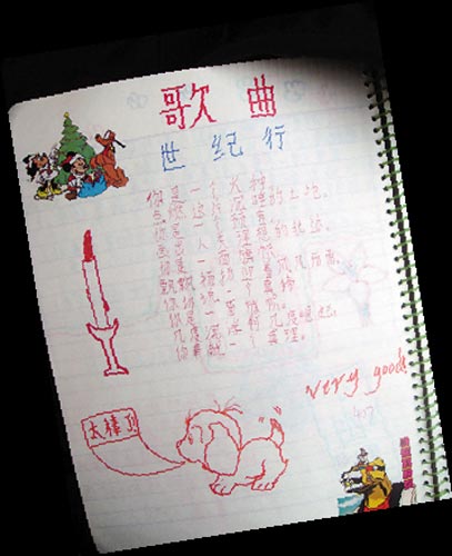 黃曉明被曝光的不是作文,而是初一時候的摘抄本,現在看來,這些摘抄本相當幼稚,封面上畫了朵很大的花,旁邊是黃大帥哥當年的稚氣簽名:“初一(1)黃曉明”。在摘抄本的內頁中,則是一些剪報和歌詞抄錄,其中的一頁剪報內容是生活小竅門《如何使松懈的毛衣恢復彈性》、《鐵鍋不宜做酸食》、《居室寬敞法》、另一頁是《蘿卜的妙用》等同類剪報,兩張剪報的空白處,都用彩筆寫著“圣斗士”“米老鼠園地”等字樣,還有一頁則是歌曲《世紀行》的歌詞抄錄,在下方是“太棒了”、“Very good”等評語。