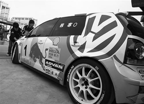 昨日中午1點(diǎn)多,記者趕到成都金港賽道,比賽還沒有開始,工作人員正在檢修各個選手的賽車。記者走進(jìn)大眾333車隊(duì)的車庫,發(fā)現(xiàn)一輛賽車上寫了一個大大的“寒”字,記者轉(zhuǎn)到車的另一邊,果然,側(cè)面車窗上清楚地貼著“韓寒”兩個字。