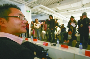 昨日,“山寨春晚”舉行媒體通氣會,發(fā)起人老孟接受采訪。記者 孫純霞 攝