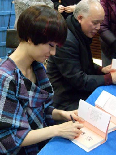 昨天的簽售會原定下午2點舉行,但到了中午12點左右已經有大量尚雯婕粉絲早早買了小說排好隊,出版社帶來的1000本小說也很快告罄。十分繁忙的尚雯婕原計劃只簽售半個小時,最后因為讀者和粉絲實在太多,最后簽售活動一直持續了近2個小時。在簽售現場,一位中年女粉絲說自己從早上9點40分就已經守候在上海書城門口等開門,她和其他幾位粉絲中午就啃著大餅將就。不過令尚雯婕欣慰的是,許多她的粉絲不僅僅是來見偶像、簽名而已,好幾位粉絲都對早報記者說,借著尚雯婕的號召力,一定要好好閱讀這部小說。