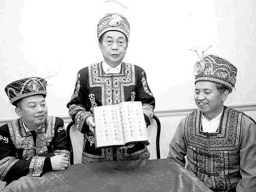 1月3日,貴州省仡佬學會副會長付爾光(中)在遵義向記者展示新近發現的漢字對照仡佬文《九天大濮史錄》。這本仡佬文用朱砂書寫、漢文為黑墨對照,記述仡佬族人發展歷史的書,據說就是傳說中的仡佬族天書。該書的發現結束了仡佬族只有語言而無文字的說法。