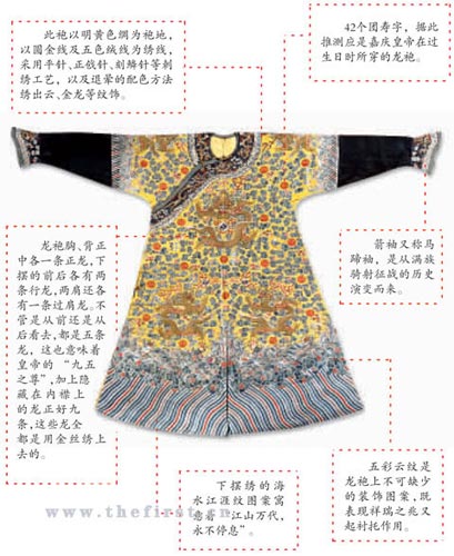 “錦衣玉食”常被用來(lái)形容奢華的生活狀態(tài),而在中國(guó)傳統(tǒng)的各種服飾中宮廷帝王穿著的龍袍算得上是頂級(jí)華服了。昨天,包括乾隆、嘉慶、光緒皇帝龍袍在內(nèi)的30件清宮服飾在北京港澳中心舉行的北緯拍賣預(yù)展現(xiàn)場(chǎng)亮相。