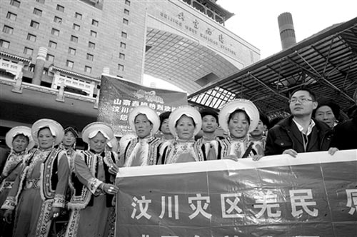 昨天中午1時(shí)許,北京西客站北一旅客出站口熱鬧非凡,來自汶川災(zāi)區(qū)的26名羌族演員身穿漂亮羌族服裝,應(yīng)山寨春晚的邀請(qǐng),乘火車抵達(dá)北京。當(dāng)老孟帶著山寨春晚團(tuán)隊(duì)與扮演陳毅元帥的特型演員馮黎,前去迎接時(shí),羌族演員手拉手激動(dòng)地跳起了快樂的鍋莊,唱起了羌族山歌。據(jù)悉,山寨春晚已進(jìn)入倒計(jì)時(shí),35個(gè)節(jié)目最后入選。外地演員已陸續(xù)進(jìn)京,晚會(huì)將于除夕夜9時(shí)9分開演,由騰訊網(wǎng)現(xiàn)場直播。昨晚起,晚會(huì)投入緊張彩排,記者昨天隨老孟前往排練基地,再次探班。