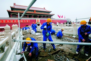 昨日下午2時,天安門前金水橋東西兩側(cè)的“品級橋”橋頭,已設2米多高的青灰色圍擋。東側(cè)的“品級橋”上,20多名佩帶天安門管委會施工工作證的工人,手持鐵錘和鑿子席地而坐,一點點“開墾”著橋面。據(jù)橋頭的安全員說,由于橋面空間較小,限制了進場施工人員數(shù)量,工人已分為兩班晝夜施工,保障工期。