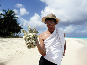 紀連海的博客圖文并茂地記錄了他這次陽光之旅,從照片上可以看出老紀心情不錯。在一張照片上,紀連海上身裹著白色浴巾,頭戴異域風情的草帽,手舉珊瑚。陽光反射在老紀1500度的眼鏡上,讓他的眼神看起來十分犀利。記者在紀連海博客留言板上看到,不少網友感嘆老紀身材惹火,造型比芙蓉姐姐擺得還好。