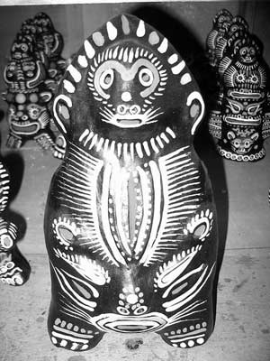 “人猴、人面猴是泥泥狗中最有代表性的造型,被視為伏羲、女媧的形象。”作家董素芝說,“雖然不同藝人的表現(xiàn)方法有所不同,但都把它塑成頭戴冠冕的正面形象,威嚴、莊嚴、神秘,絕無一般玩具中動物猴的頑皮姿態(tài),究其原因,它是被藝人當做‘神’來塑造、來崇拜的。”