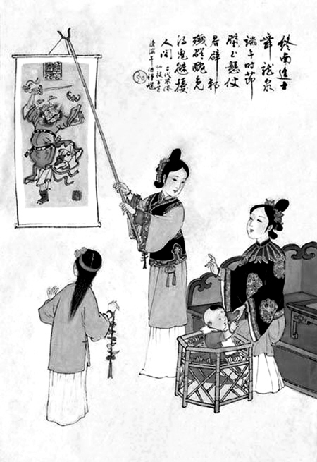 端午節期間,有些地方還流行居室中懸掛鐘馗像的習俗,據清代《北平風俗類征》記載:“五月初一至初五為端陽節,午時以朱墨畫鐘馗像,用雞血點眼,俗稱‘朱砂判’者懸屋中,謂能驅邪!鳖櫟撛谒摹肚寮武洝分幸灿杏浭觯骸斑m逢端午,堂中掛鐘馗畫圖一月,以祛邪魅!辩娯改颂瞥忻嫾覅堑雷庸P下的人物。據宋代《醉翁談錄》云:“除夜,舊傳唐明皇是夕夢鬼物,名曰鐘馗,既覺,命工繪畫之。至今人家圖其形,貼于門壁!毕鄠,唐明皇李隆基一次久病不愈,偶有一夜,夢見一大鬼捉去一小鬼,大鬼聲稱自己名鐘馗,試武舉未中,誓為皇帝陛下除天下妖孽。唐明皇夢醒,即刻病好。于是,便命吳道子將夢中的鐘馗捉鬼作成一幅畫,掛于宮中以避邪和鎮妖。