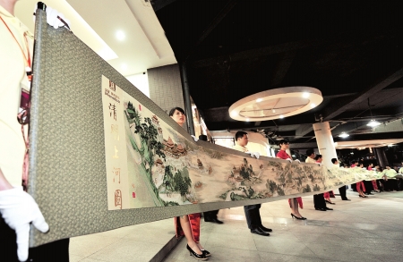 經過37位設計師1年半時間的研發,18位專業高級繡師歷時180多天、巧奪天工的繡制,長22米的《清明上河圖》十字繡,昨晚在成都首次公開亮相。這幅特殊的十字繡總共使用了116505米繡線,共計2032611針,重達20600克,是目前世界上最長的十字繡藝術品。18位技師從2008年7月20日起開始繡制,至2009年1月20日完工,共繡制人物814人,動物83匹,船只29艘,房屋樓宇30多棟,車13輛,轎8頂,橋17座,樹木180棵,人物往來衣著不同,神情各異,栩栩如生。作品將在第二屆非物質文化遺產節上正式展出。