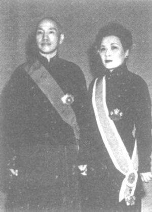 1927年12月1日,蔣介石和宋美齡舉行婚禮。婚禮分兩次進行:先在宋宅會客廳中舉行西式婚禮,后在戈登路大華飯店出席中式婚禮。大華飯店的婚禮在樂曲聲中宣告完成后,蔣介石和宋美齡來到花園攝影。在一系列由中華照相館的師傅拍攝的結婚照片上,蔣介石穿尖領襯衫、打淺色領帶,配著深色西服,胸口還別著花,宋美齡則身穿淺色旗袍,斜披白紗,頭戴一個用花蕾編成的小花冠,手捧一束玫瑰。