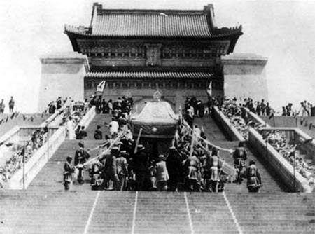 6月1日是“奉安日”。凌晨2時,“總理奉安委員會”特備的汽車已停在國民黨中央黨部二門前院內(nèi)。奉安總指揮朱培德、總干事孔祥熙以及各組正副主任都已到場,指揮各干事分別做好準(zhǔn)備。從凌晨2起,沿中山路兩旁已擠滿送殯的群眾。3時20分,宋慶齡、孫科夫婦及子女、蔣介石夫婦、宋子文夫婦、宋靄齡、楊道儀(朱執(zhí)信夫人)、唐紹儀、陳少白、張繼、葉恭綽、頭山滿、犬養(yǎng)毅、梅屋莊吉、宮崎龍介以及國民黨全體中央委員、國民政府委員、葬事籌備委員、迎櫬專員、各國專使代表等陸續(xù)到達中央黨部禮堂門口等候。4時開始移靈典禮。典禮由胡漢民主祭,由孫中山家屬、親故及國民黨中央委員、國民政府委員、奉安委員、迎櫬專員、葬事籌備委員等恭候靈櫬,總干事孔祥熙執(zhí)旗前導(dǎo)。4時15分,獅子山炮臺開始鳴禮炮一百零一響,靈櫬移出大門,抬上縞素的靈車。汽車的四周扎掛白色彩球,覆蓋黨旗、國旗。靈櫬扶上汽車后,孫中山家屬、親故及各委員、各國專使等即加入第七行列,宋慶齡、陳淑英、孫琬、何香凝、宋美齡、宋靄齡等家屬和女眷在特制黑色布幔內(nèi)步行出中央黨部禮堂,分乘馬車隨靈護送,其余男賓則分左右兩列分別執(zhí)紼步送。4時25分,號兵吹起啟行號,靈車啟動。軍校學(xué)生200余名為護靈團,全副武裝,分列兩側(cè),隨行護衛(wèi)。鐵甲車及騎兵連在前面開道,由一名騎兵長官騎黑馬,手執(zhí)開道旗。送殯各機關(guān)團體共分十行列,在事先指定的地點依次加入,隊伍長達五六里,朱培德任總指揮,姚琮、谷正倫、張治中分任各有關(guān)行列指揮。
