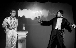 他的魔術(shù),每次都能迷惑所有人,因為無論怎樣,這都像兩個人“打配合”的表演:希臘魔術(shù)師、國際魔術(shù)界公認(rèn)最好的電影魔術(shù)大師喬哥斯,在幕布做成的鏡子前,捧出一個小瓶子。裊裊煙霧中,一個古裝魔術(shù)師從瓶中鉆出,如阿拉丁神燈的傳奇。一古一今兩個魔術(shù)師,能在鏡子內(nèi)外拿球互擲“打架”,能忽地變出槍射擊。更不可思議的是,鏡中的古代魔術(shù)師還能走出鏡外,成為一個有血有肉的人,原來的人,則變成“影子”。