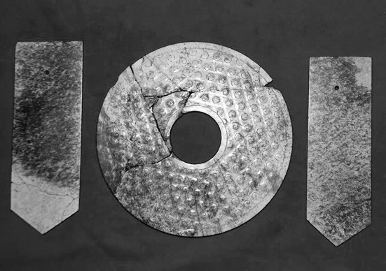 經過仔細觀察,專家在1982年出土的玉璧上面發現了很多雕刻的細小花紋。這些花紋是在玉的表面雕出一些稍微鼓起的小圓點,圓點上面有一個小渦紋,就像一只小蝌蚪,考古學上將其稱之為“谷紋”。因為早期的璧是樸素無華的,多數都沒有花紋,一直到周代,玉璧上才開始出現小花紋,到春秋戰國時期,基本上整個都是一樣的紋飾,以谷紋璧居多。所以專家肯定地將這組玉器的年代鎖定在春秋戰國時期,這也意味著它們具有較高的考古價值。