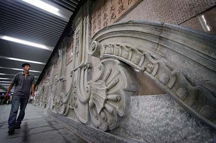西單地區在上下行電梯頂部懸掛了《老字號》、《老北京》的浮雕作品,映襯了其“核心商業區”的地位。